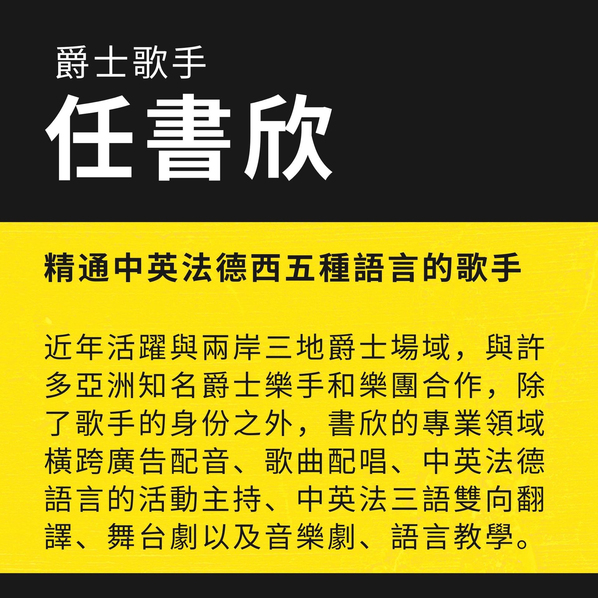 爵士歌手、多國語言活動主持人、配音員、中英法德語言教學、音樂 & 舞台劇演員