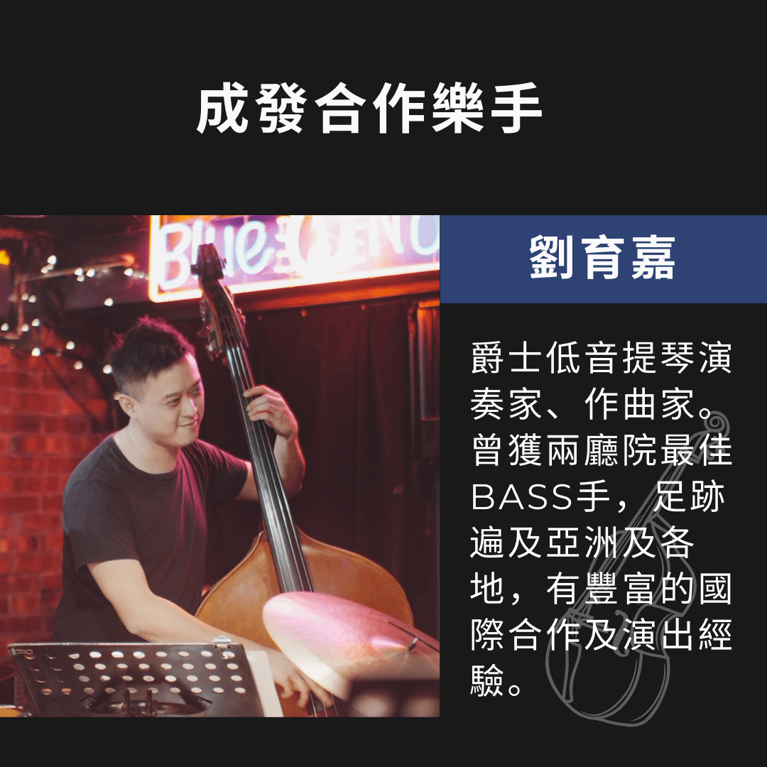 劉育嘉老師的學習歷程十分多元,就讀國立台南藝術大學中國音樂學系及國立東華大學音樂系-爵士組、主修低音提琴。曾獲兩廳院最佳 Bass手,並於 2015 年於兩廳院爵士音樂營-研習營開始擔任教師一職,致力於爵士音樂推廣教育以及原創音樂發表。2106年榮獲台北爵士樂壇新秀比賽第一名。同年參與『揮灑烈愛』多媒體跨界音樂劇,於國家音樂廳演出。2018 年開始與德裔鋼琴家 Julian Moreen 共同策劃『原創音樂巡迴演出計畫』並擔任台灣及亞洲地區總策劃,並以 Julian Moreen 為首組成 Julian Moreen Quartet。2019 年隨 Julian Moreen Quartet 受邀於台灣台中爵士音樂節演出、並策劃亞洲地區交流與展演。同年參與『瘋戲樂』年度大戲《台灣有個好萊塢》擔任樂手一職。
